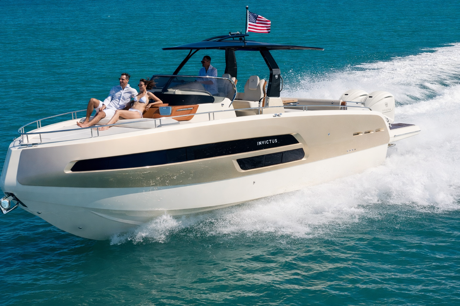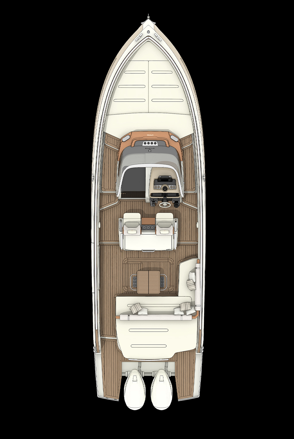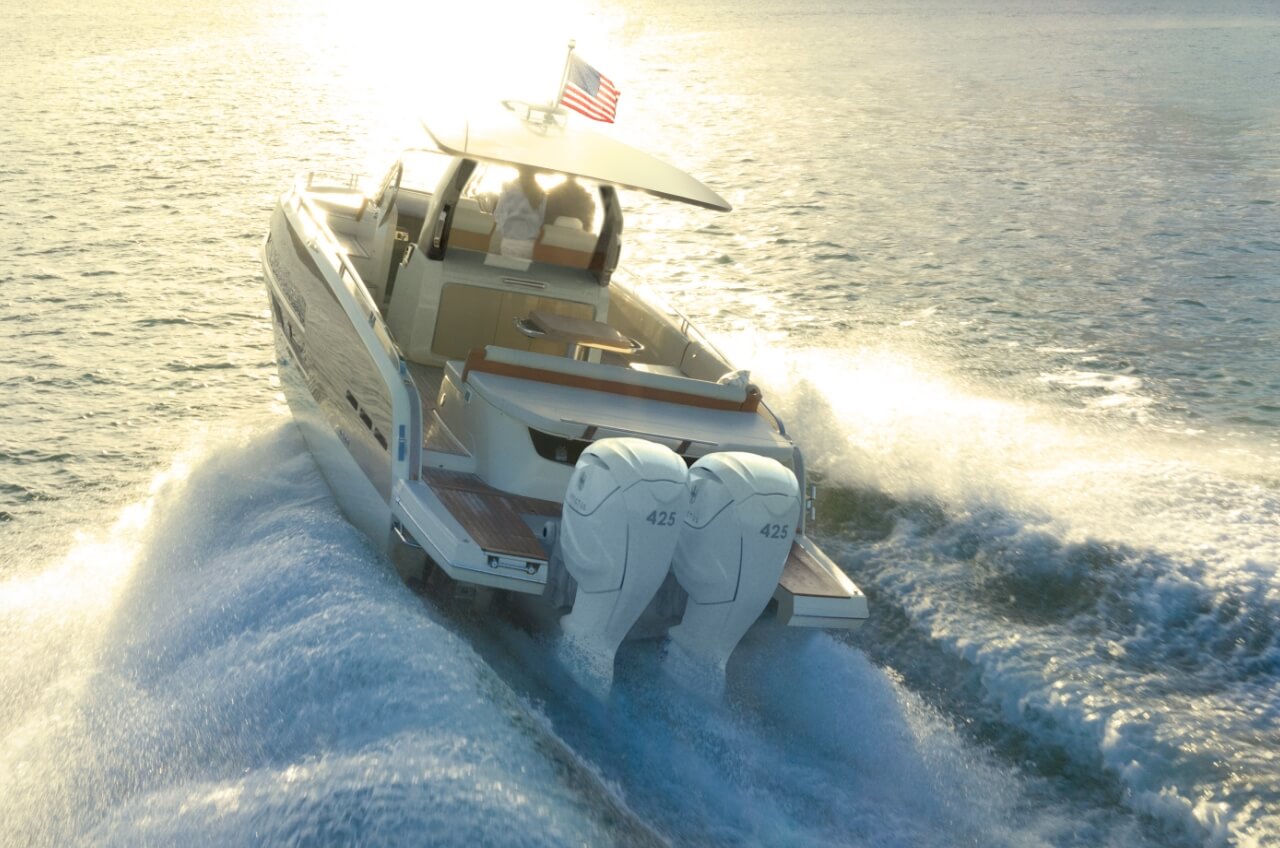 • The enclosed main deck offers a salon, a customizable kitchen, and a helm station, all with panoramic views thanks to large glass surfaces.